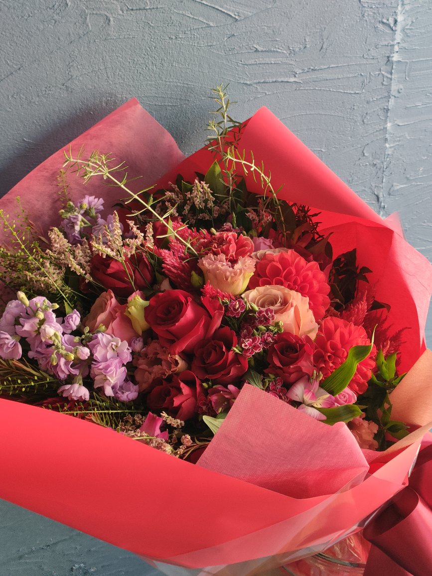 還暦のお祝いにお母さまへお渡しする、赤系をメインにした華やかな花束。赤一色ではなく、赤に合わせた色合いも織り交ぜて、上品で明るい印象に仕上げます。感謝と祝福の気持ちを込めた特別な贈りものに。